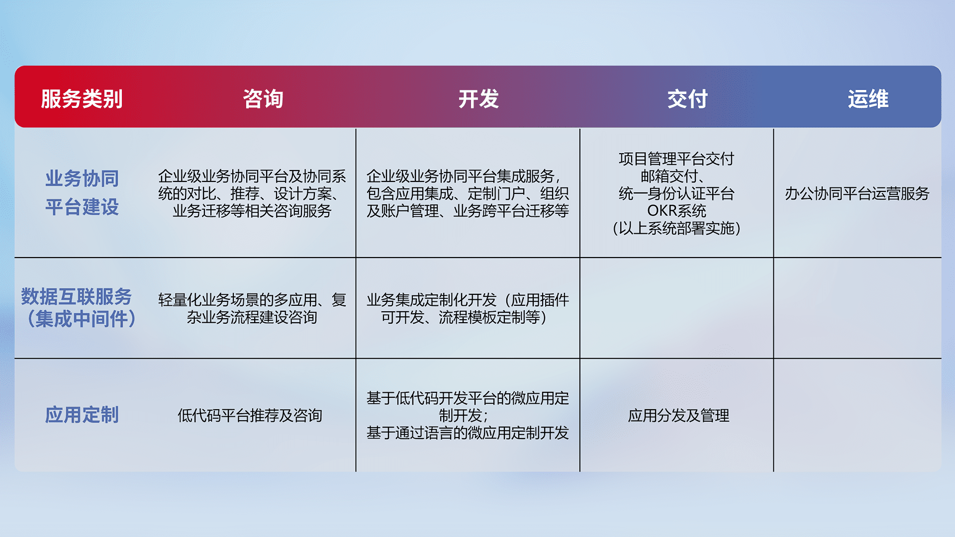 针对钉钉、、企微、、IDaas等平台级产品提供产品的规划、、、、方案、、、交付、、定制化开发等服务,,实现如统一协同办公、、、智能客户服务、、混合会议管理、、、、智能数据查询、、等业务场景,,实现数字化转型。。